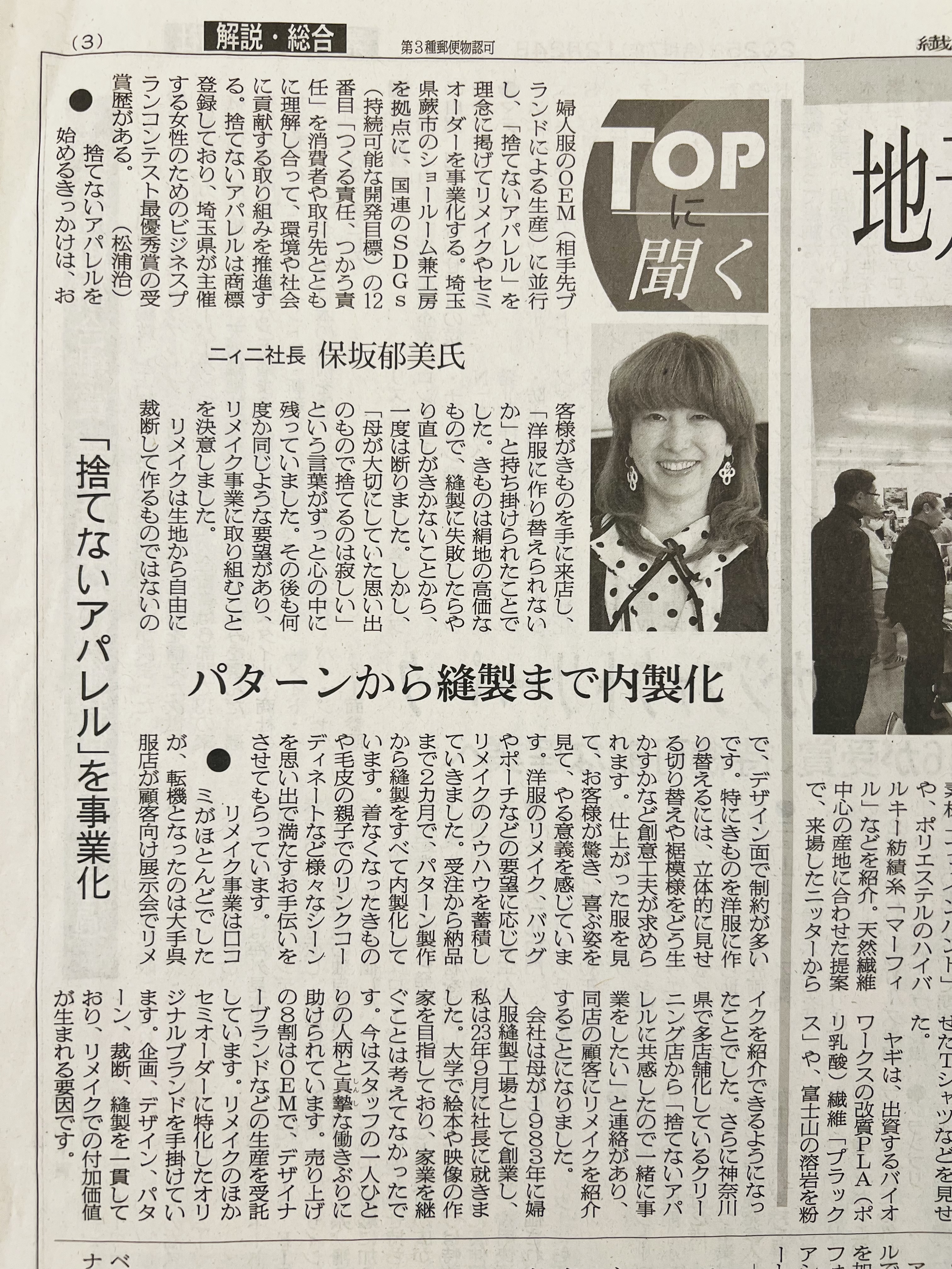 この度12月24日(水)、有り難いご縁を頂戴し、アパレル業界新聞の繊研新聞『TOPに聞く』のコーナーに、ニイニの取り組み「捨てないアパレル」について、取り上げていただきましたので、ご紹介させていただきます。