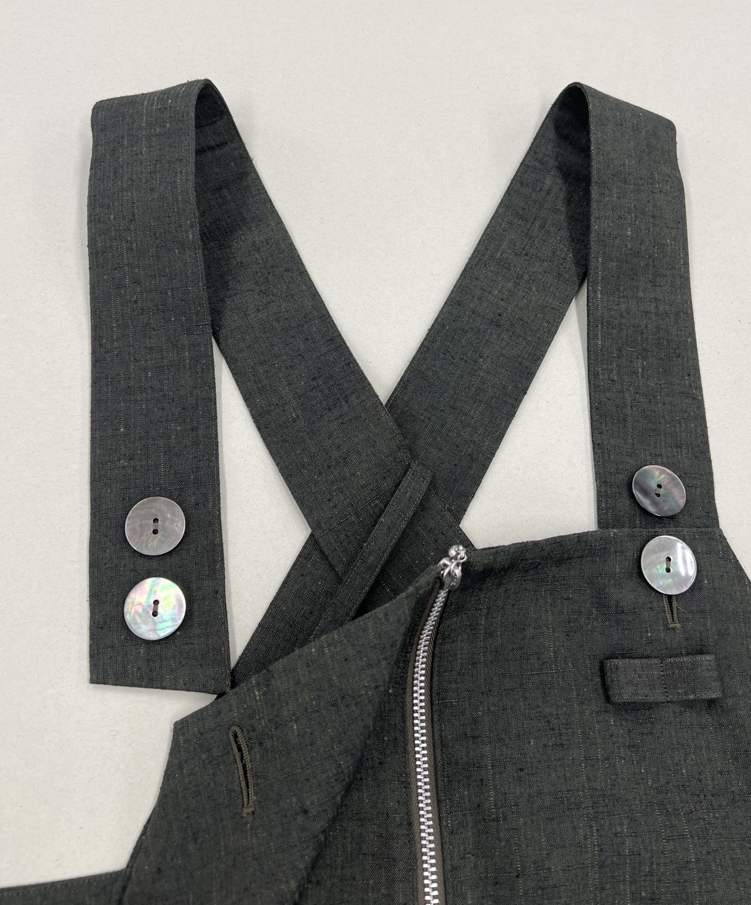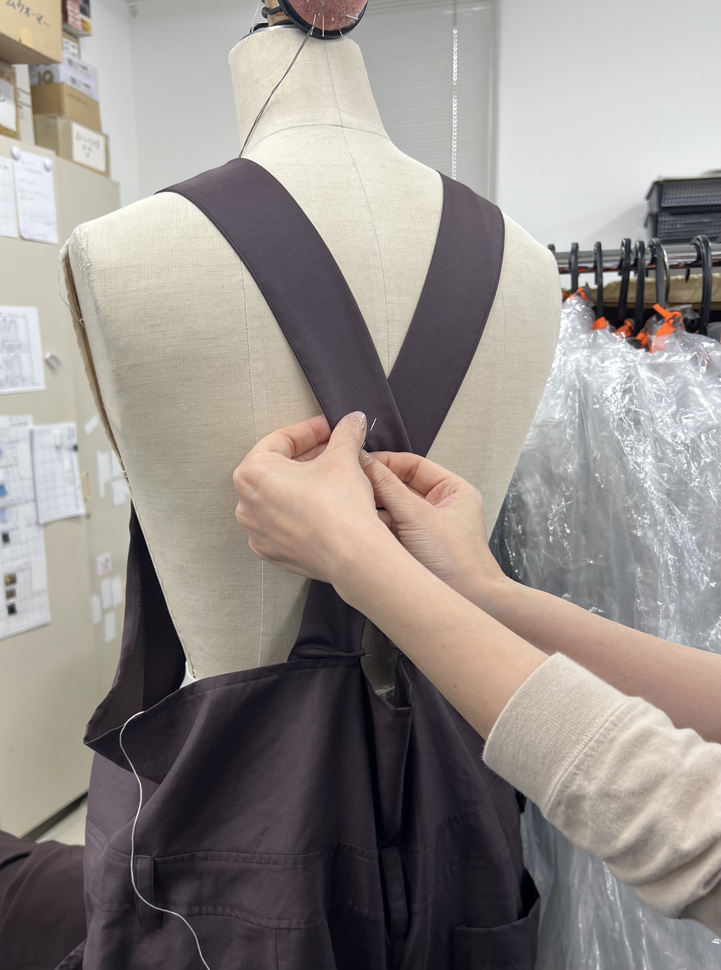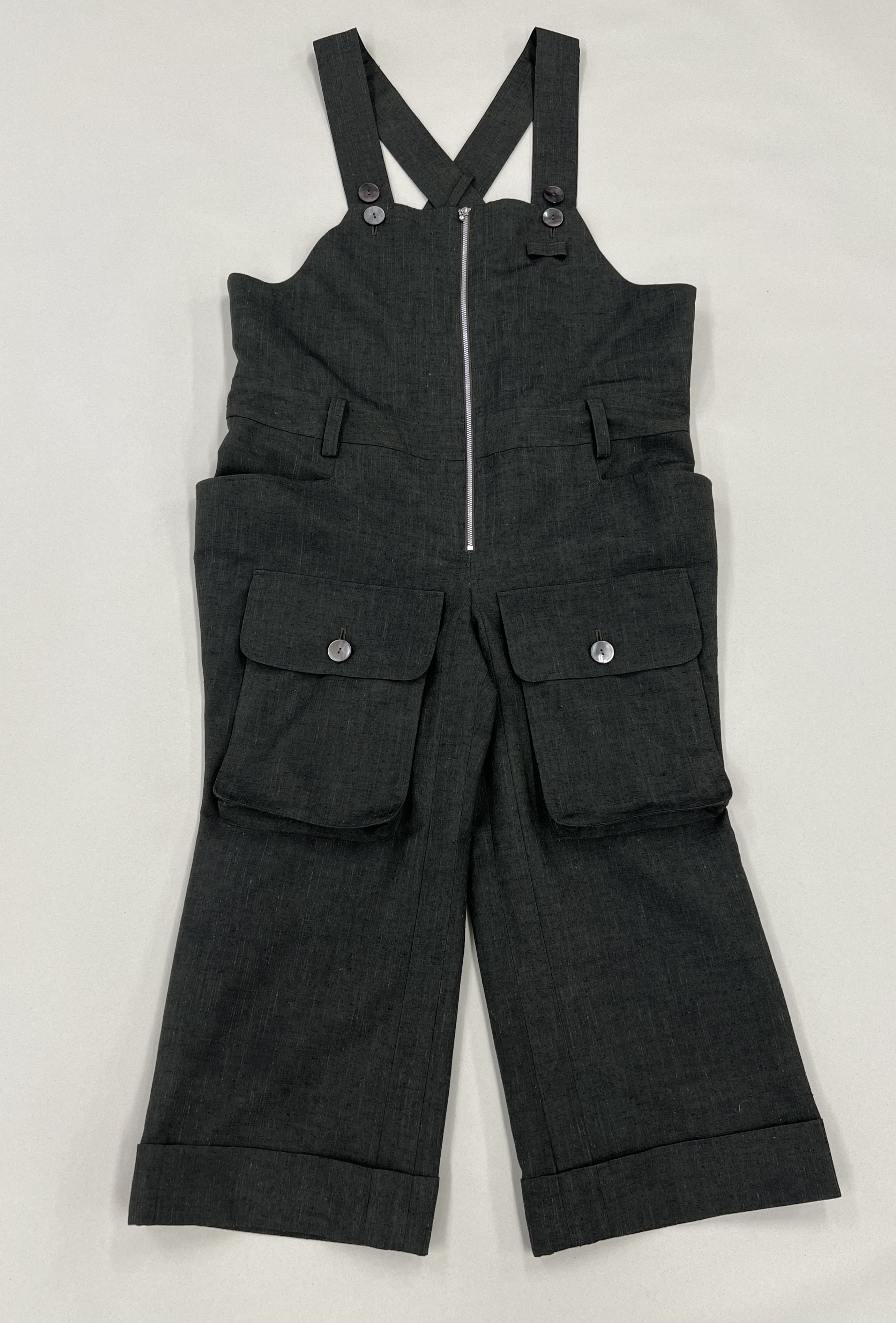 話の発端は私がたまたま履いていたパンツが良いとなり、最初はそれを作る予定でした。でも、次第にそうではなく、パンツ部分のデザインはそのままに、オーバーオールにした方が、自分好みで長く着れる、とお話いただきました。
